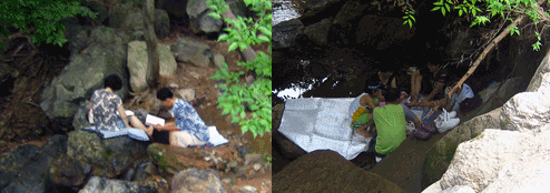 계곡으로 내려오니 물놀이하고 책 읽는 사람들도 많았지만 상당수가 동양화놀이에 빠져들 있더군.... 그런자리엔 꼭 막거리나 소주도 함께~ 눈쌀 찌푸려지지는 않았지만 조금 자제했으면 하는 바람이 있다.