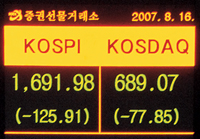 그런와중에 어제 하루는 서브프라임 모기지 충격을 감당하지 못하고 종합주가지수가 역대최고인 -125.91포인트를 기록했다.