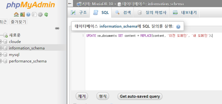 UPDATE xe_documents SET content = REPLACE(content, '이전 도메인', '새 도메인');
